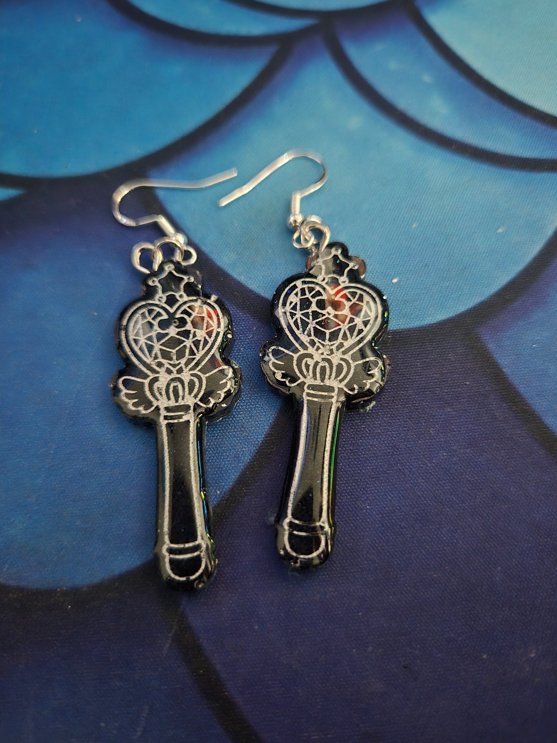 These Sailor Moon-inspired resin earrings beautifully capture the iconic Moon Wand’s charm. Crafted with precision, each earring showcases detailed elements that replicate the wand’s design, offering a delicate yet striking accessory. Lightweight and durable, they add a magical touch to any outfit while reflecting expert craftsmanship in resin artistry. Perfect for fans and collectors seeking both style and subtle fandom expression.