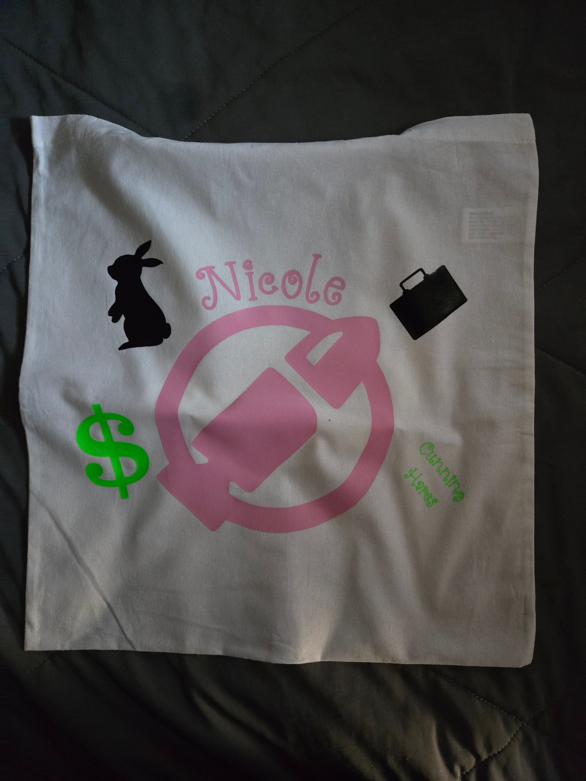 Iron on vinyl tote bag that matches the character's color and a custom design of the character.
