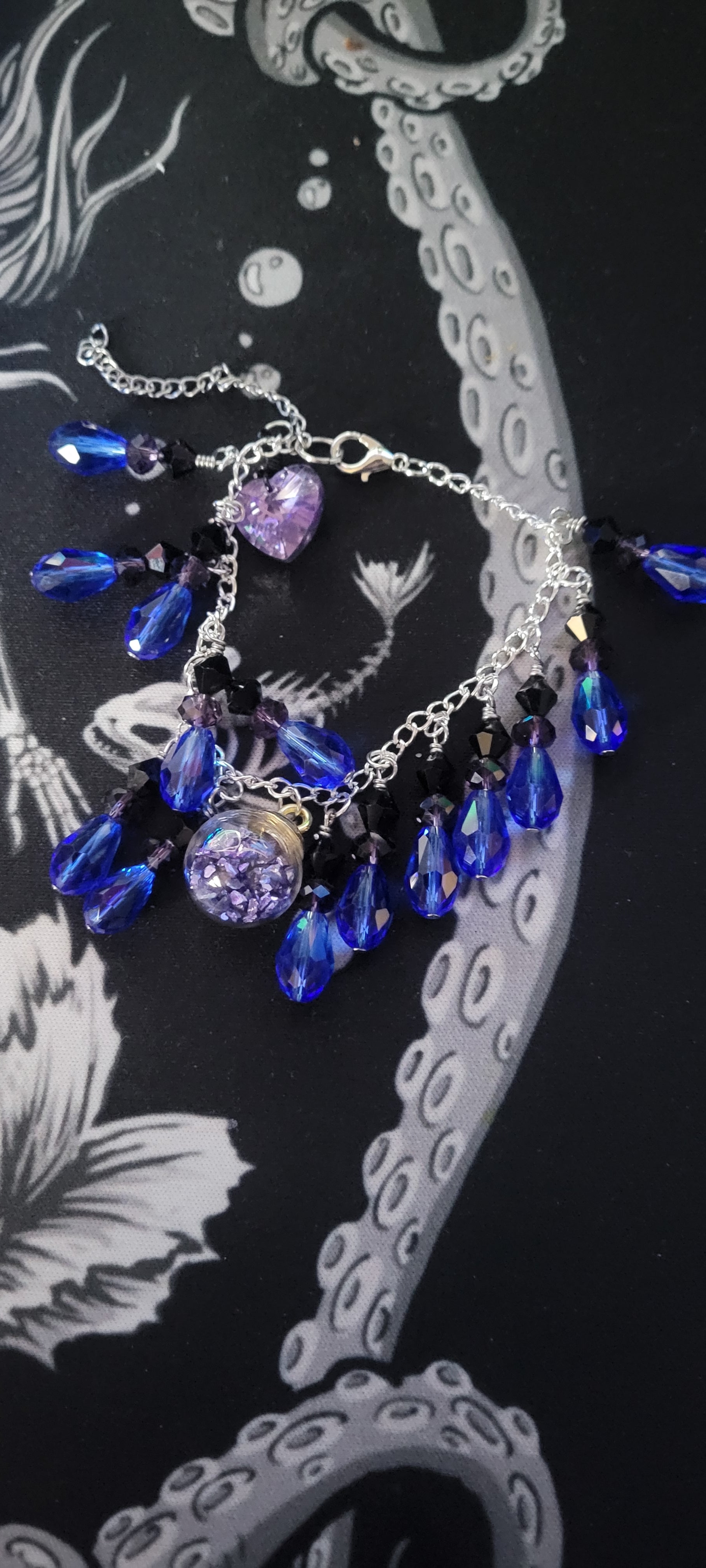 A charm bracelet with crystal beads to match the character's outfit. The bracelet also has charms to it and a heart charm at the end of the bracelet, which is my signature to it. The charm bracelet also has a charm at the center of the bracelet that looks like the person's vision.