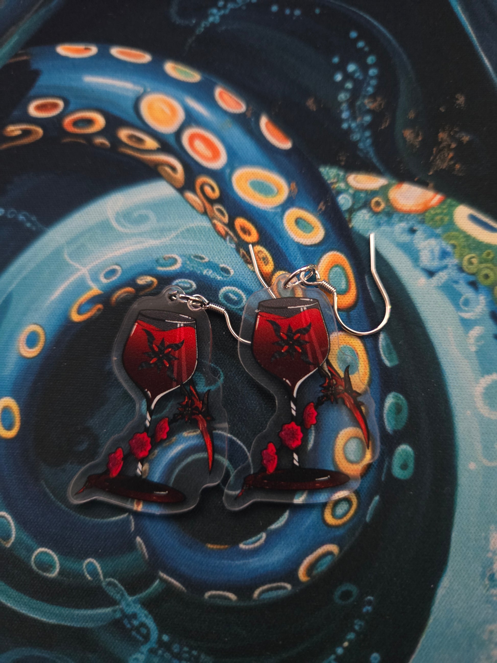 These acrylic earrings feature an intricate design inspired by the popular Genshin Impact cocktail, combining vibrant colors and fine craftsmanship. Lightweight and durable, they offer a stylish accessory for fans who appreciate subtle gaming references. Perfect for daily wear or special occasions, these earrings add a unique touch to any outfit while showcasing your passion for Genshin Impact.